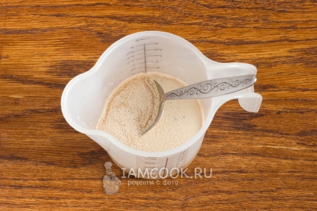Сухие дрожжи разведите в теплой воде. Добавьте 2 ст.л. сахара и щепотку мелкой соли. Перемешайте.