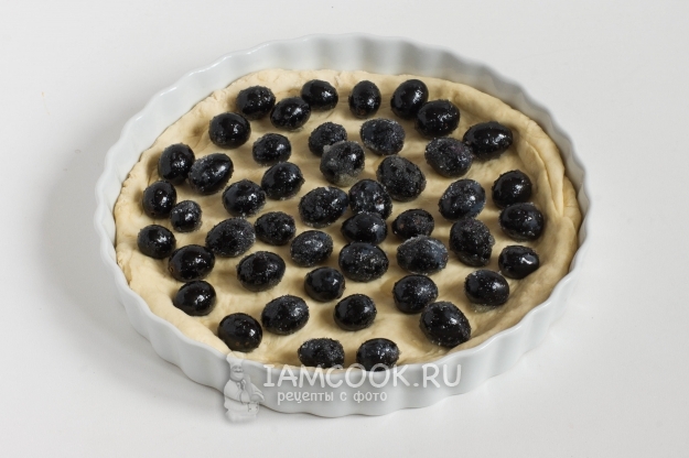 Слегка вдавливая, выложите виноград на тесто. Можно полностью заполнить все пространство виноградом, но тогда будет выделяться очень много сиропа, тут решите сами. Мне нравится и так, и так: и полностью заполненное тесто, и наполовину.