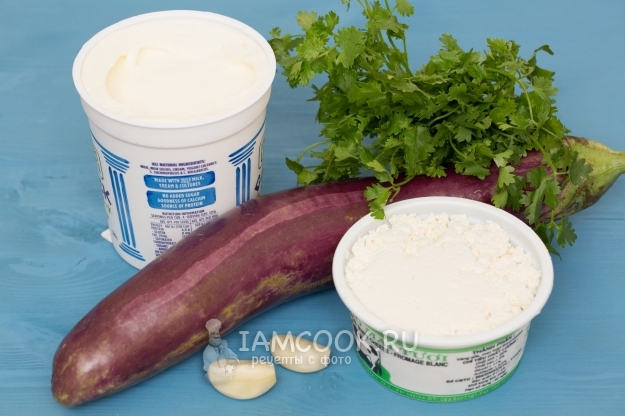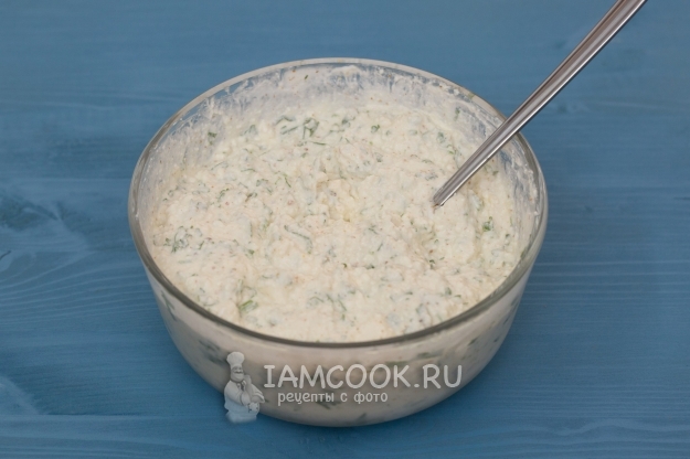 Смешать все составляющие для творожной начинки. Кинзу мелко порубить. Чеснок натереть на мелкой терке.