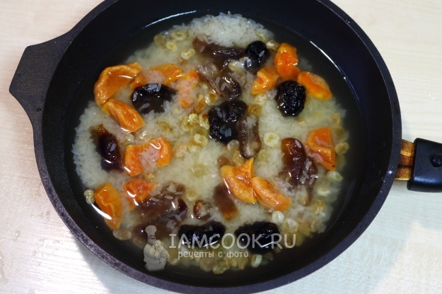 Выкладываем сухофрукты на сковороду, заливаем водой и всыпаем тщательно промытый рис. Солим блюдо и готовим до впитывания жидкости и мягкости риса.