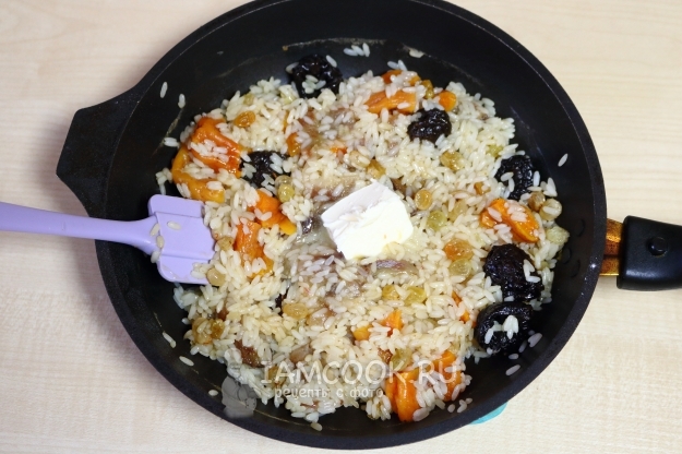 В готовый плов добавляем сливочное масло. По вкусу можно подсластить рис медом или сахаром.