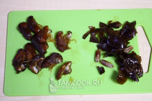 После замачивания все сухофрукты промываем. Курагу разрезаем на несколько частей.