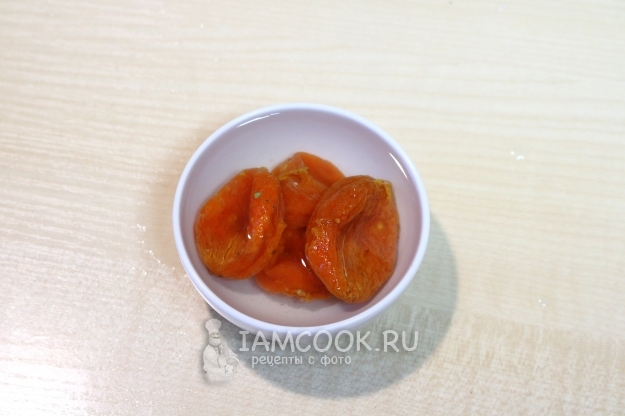 Для начала подготовим сухофрукты. Курагу зальем кипятком и оставим до размягчения.
