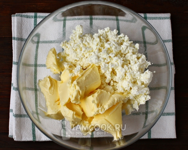 В емкость кладем творог и масло. Взбиваем миксером на небольшой скорости.