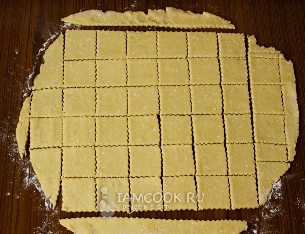 Стол немного припыляем мукой и раскатываем тесто в пласт толщиной 7-8 мм. Фигурным или обыкновенным ножом разрезаем пласт на квадраты желаемого размера или на прямоугольники. Как вариант можно использовать формочки для печенья. Остатки теста собираем в шар, раскатываем и разрезаем.