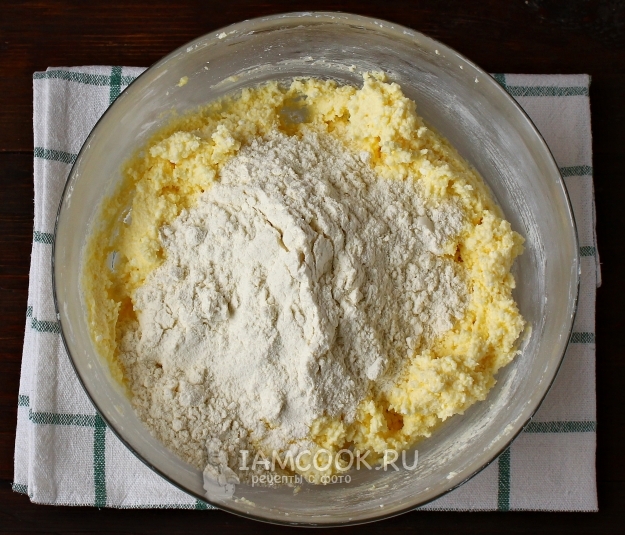 Постепенно добавляем муку, смешанную с разрыхлителем. Перемешиваем ложкой.