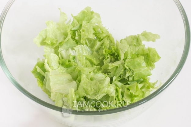 Промойте листья салата и руками порвите их на небольшие кусочки. Поместите измельченный салат в миску.