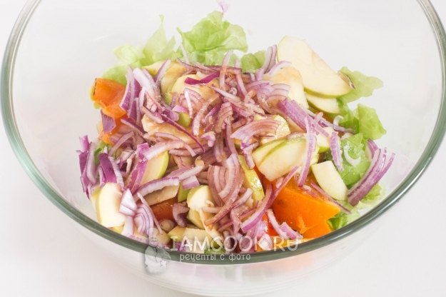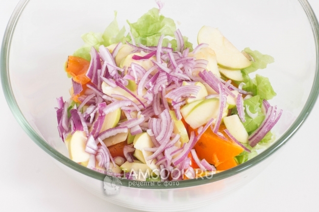 Красный лук перед добавлением в салат можно замариновать в лимонном соке или в яблочном уксусе, предварительно обдав кипятком, тогда лук не будет сильно резким.