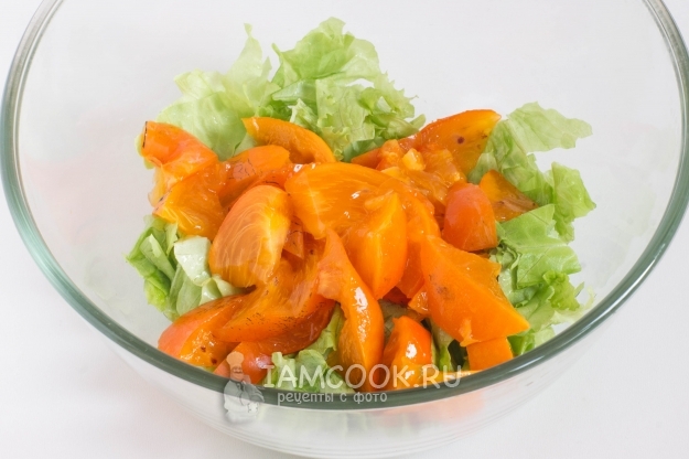Хурму промойте, нарежьте небольшими кусочками, которые удобно будет кушать, и добавьте в миску к салату.
