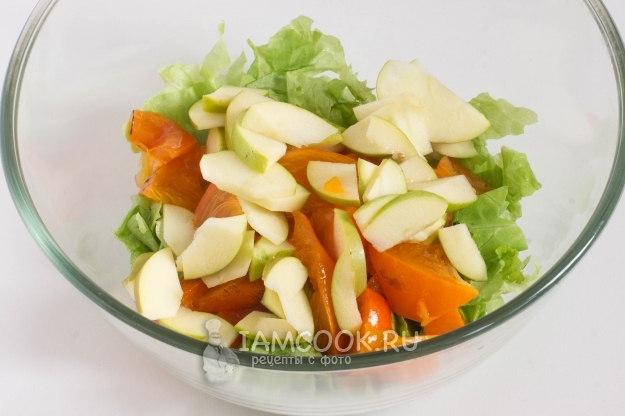 Дайте салату из хурмы с яблоками немного постоять перед подачей. На свой вкус можно добавить черный молотый перец в заправку или непосредственно в сам салат.