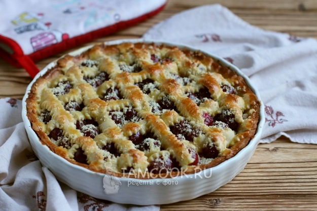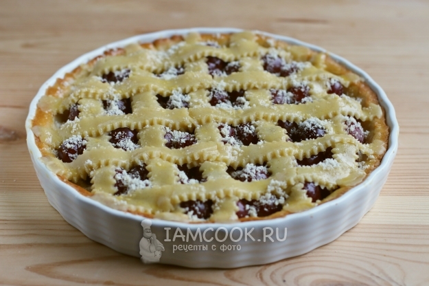 Из оставшегося теста с помощью фигурного ножа вырезаем полоски и укладываем на пирог, посыпаем оставшейся миндальной мукой. Сразу же отправляем форму в духовку и допекаем песочный пирог с черешней до готовности.