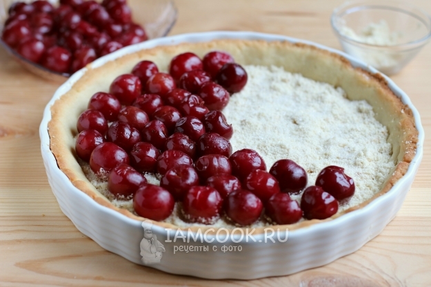 Дадим основанию пирога остыть, затем посыплем его миндальной мукой и разложим черешню. Оставим немного миндальной муки для посыпки ягод.