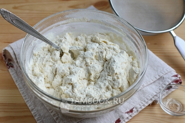 Далее просеиваем во взбитую массу муку с разрыхлителем и содой, после чего замешиваем тесто.