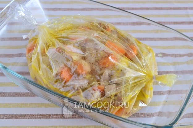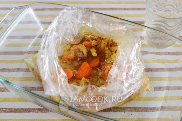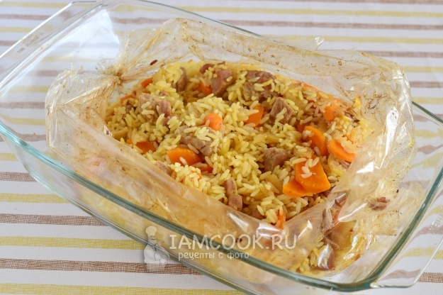 Завязываем вторую сторону рукава для запекания и отправляем форму с пловом в разогретую до 170°С духовку на 70 минут.