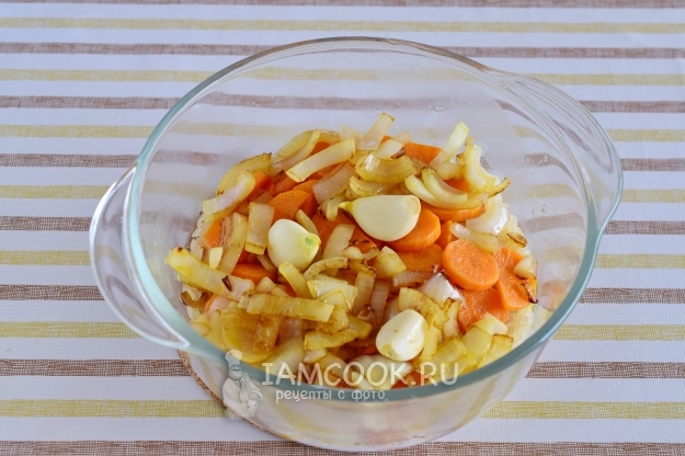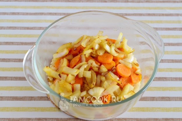 Морковь очистим и нарежем полукружочками или кружочками. Лук очистим и нарежем четверть-кольцами.