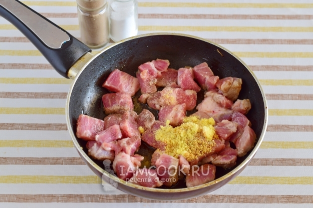 Все в той же сковороде обжарим мясо, добавив в него приправу для плова, минут 10, помешивая.