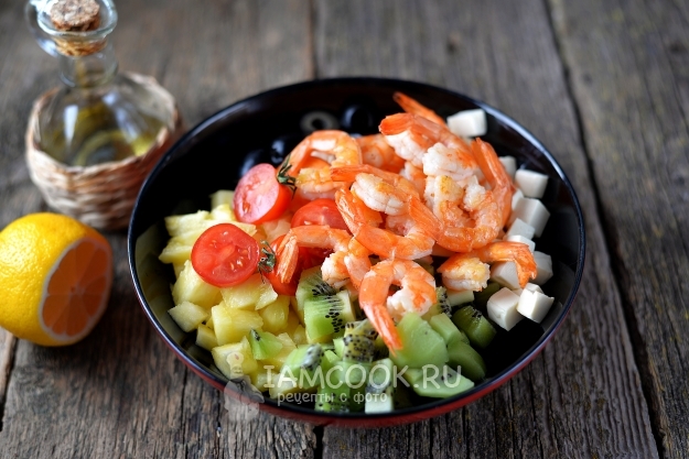 Добавьте креветок, помидоры черри, нарезанные кружочком маслины без косточки и сыр. Полейте все ингредиенты лимонным соком и любимым постным маслом без вкуса. Аккуратно все перемешайте.