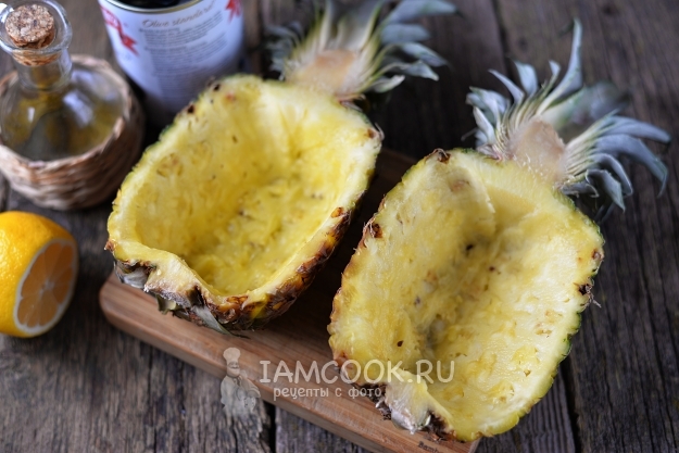 Разрежьте ананас вдоль на две половины, вырежьте аккуратно мякоть, удалите жесткую сердцевину.