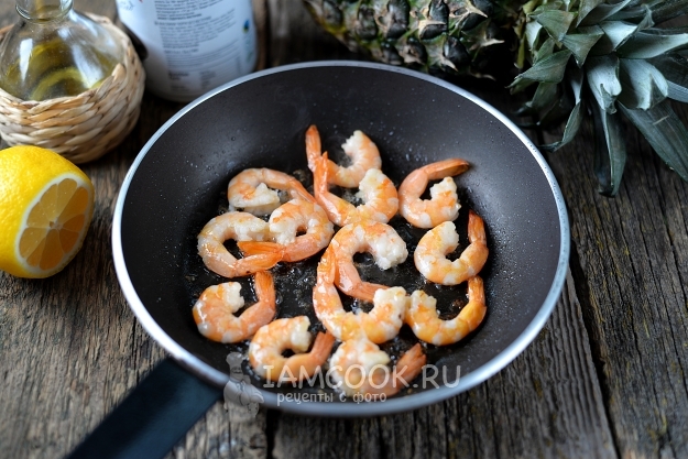 Разогрейте немного постного масла в сковороде, обжарьте креветочные хвосты около минуты, остудите.