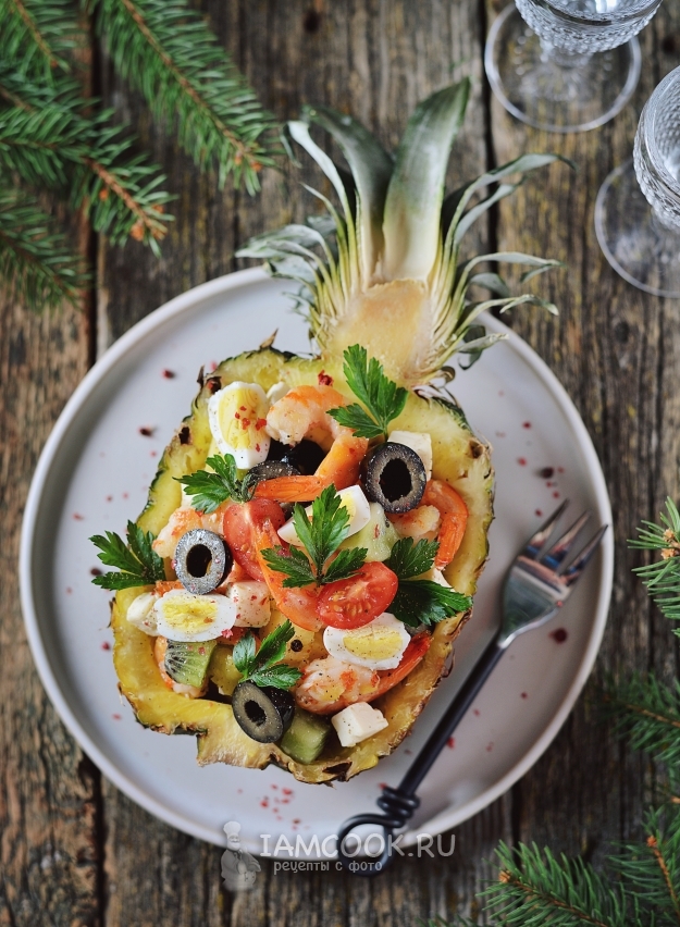 Вкусный и очень эффектный праздничный салат с креветками в ананасе готов. Приятных вам новогодних праздников.