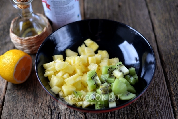 Мякоть ананаса нарежьте мелким кубиком. Очистите киви, нарежьте также кубиком, сложите все в глубокую миску.