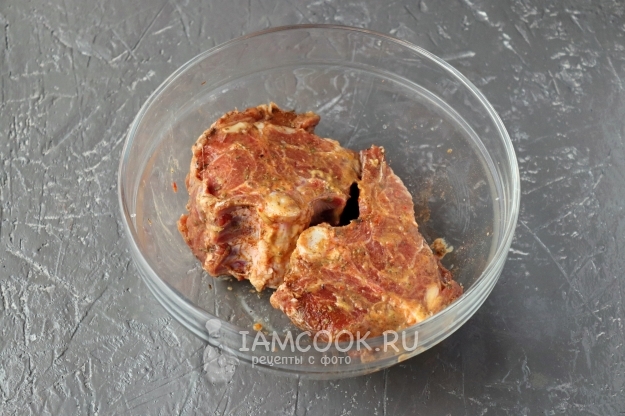 Козье мясо (любые части) помойте под проточной водой и обсушите бумажными полотенцами. Тщательно натрите специями, а затем смажьте смесью кетчупа и горчицы. Выложите мясо в миску, затяните пищевой плёнкой и отправьте в холодильник на пару часов, а лучше - на ночь. Дело в том, что данный вид мяса имеет специфический запах и вкус, поэтому нужно его хорошо промариновать.