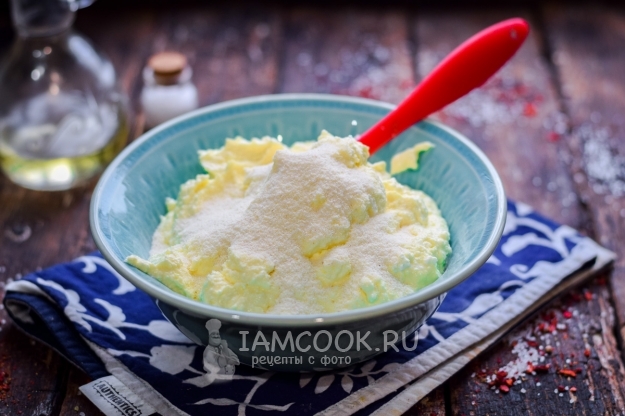 Теперь добавить в чашу сливочное масло и сахарный песок. Взбить все ингредиенты до однородности. Добавить щепотку соли в чашу.
