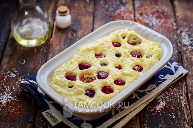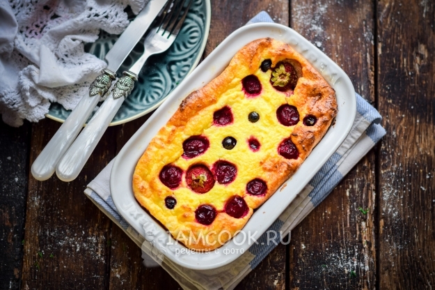 Теперь переложить в форму замороженные вишни без косточек и клубнику. Переставить заготовку в духовку, запекать 25-35 минут. Спустя время творожную запеканку с вишней и манкой можно подавать к столу.