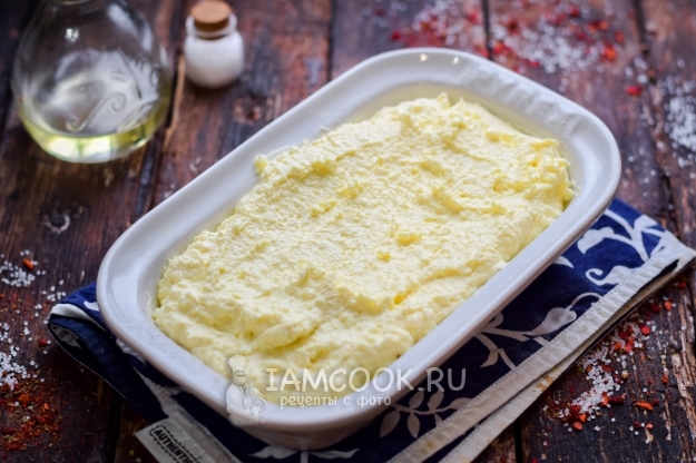 Духовку прогреть до 180 градусов. Форму слегка смазать маслом. Переложить творог в форму.