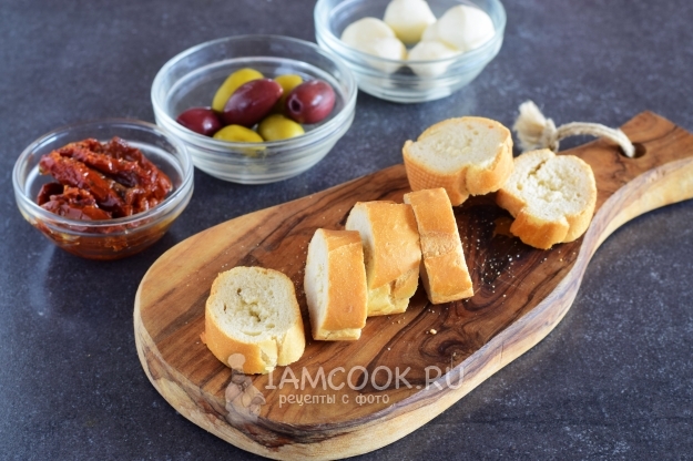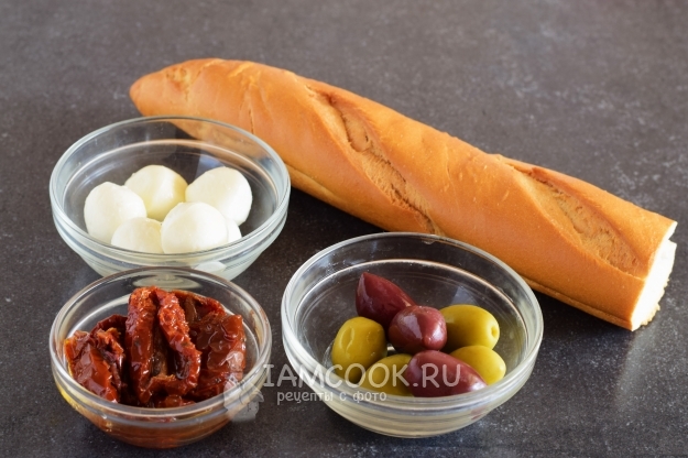 Итак, подготовим продукты. Можно взять и один шарик моцареллы, затем нарезать его на кусочки, если не найдете моцареллу в шариках. Хлеб подойдет любой: и белый, и черный. Вяленые томаты используем только те, что в масле.
