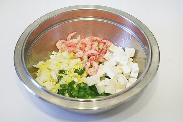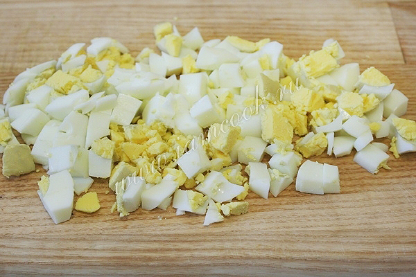 Яйца отварите вкрутую. Остудите. Очистите. Нарежьте небольшими кубиками.