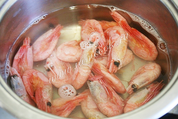 В кастрюлю налейте немного воды. Доведите до кипения. Выдавите в воду сок из лимона. Бросьте креветки в воду. Снимите кастрюлю с огня и оставьте креветки в воде на 1-2 минуты. (Варить не надо, поскольку я использую уже варенные, но замороженные креветки).