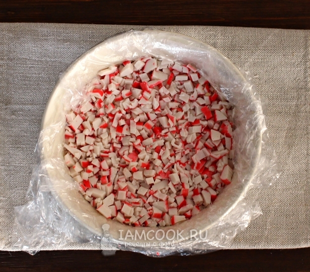 Затем на черные жемчужины» распределяем масло, которое осталось. На масло равномерно распределяем остатки сыра, легонечко утрамбовываем и промазываем майонезом. На сырный слой равномерно распределяем оставшиеся крабовые палочки и смазываем их майонезом. Завершающий слой – вторая половина измельченных яиц. Немного уплотняем этот слой.