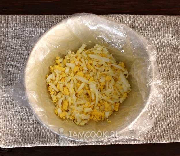 Составляющие подготовлены. Емкость застилаем пищевой пленкой, сложенной вдвое, чтобы концы свисали. Размер моей емкости: дно - 8,5 см, верх - 18 см, высота - 9 см. Слои будут повторяться, за исключением слоя с черносливом, поэтому каждый слой будет состоять из половины приготовленных ингредиентов. Первый слой - яйца.