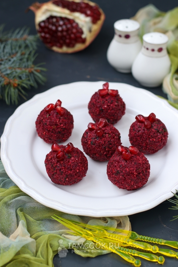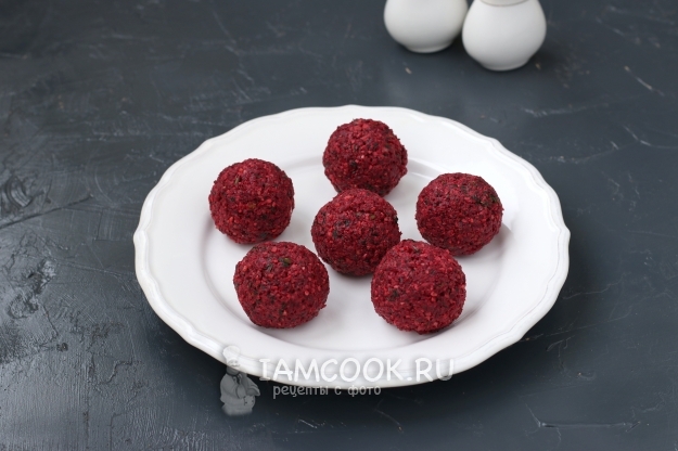 Если свеклу сварить заранее, то приготовление не займёт много времени. Количество гранатового сока нужно регулировать, чтобы из массы легко сформировать шарики.