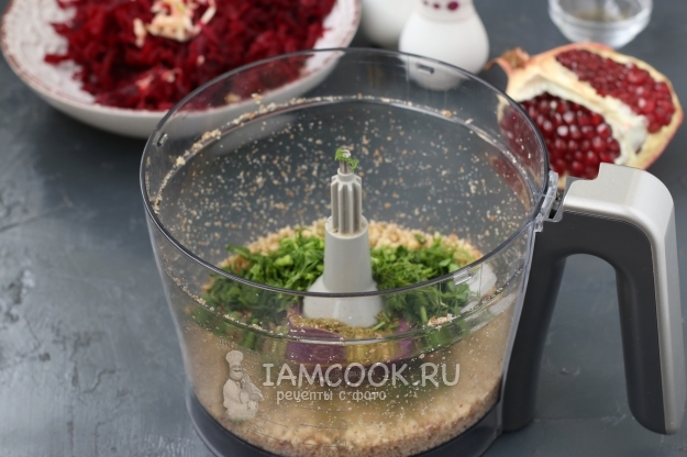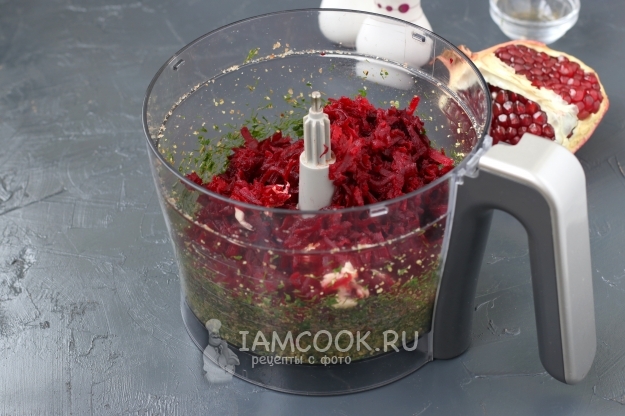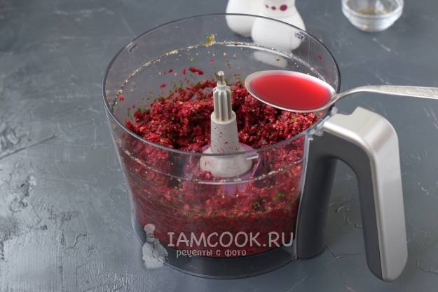 Выжать из граната сок, частями добавлять его в свекольную массу до нужной консистенции.