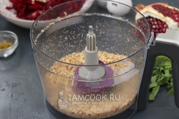 Первыми в чашу комбайна необходимо высыпать орехи и измельчить, используя насадку "металлический нож". Орехи должны измельчаться до мелкой крошки.