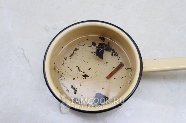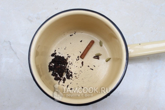 В кастрюлю выкладываем чай и пряности. Тут главное - не переборщить с гвоздикой, так как гвоздика сильнее всех отдает свой пряный вкус.