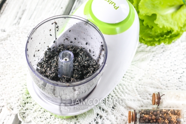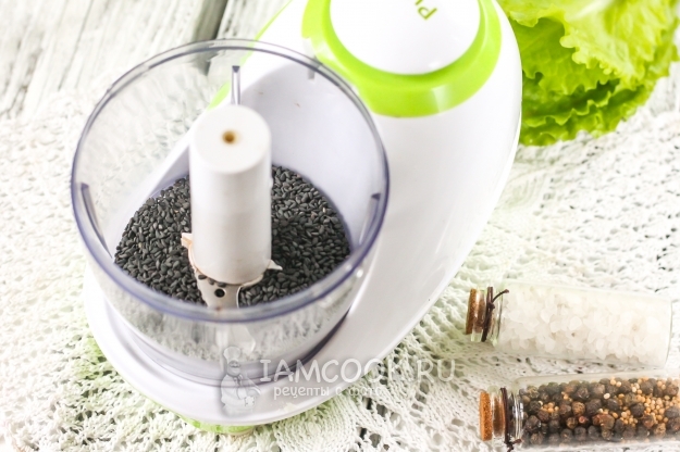 Если семена черного кунжута сырые, не прожаренные, то застелите дуршлаг двойным слоем марли, высыпьте туда семена и промойте их от пыли, затем слегка обсушите бумажным полотенцем. Если кунжут сушеный, то эту процедуру можно пропустить. Всыпьте семена в чашу измельчителя или блендера.