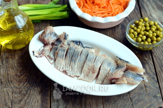 В первую очередь займитесь разделкой рыбы — снимите пленку сверху, удалите хребет, хвост и голову. Далее достаньте кухонным пинцетом все кости — крупные и мелкие. Подготовленное филе сельди нарежьте поперек полосками средней толщины.