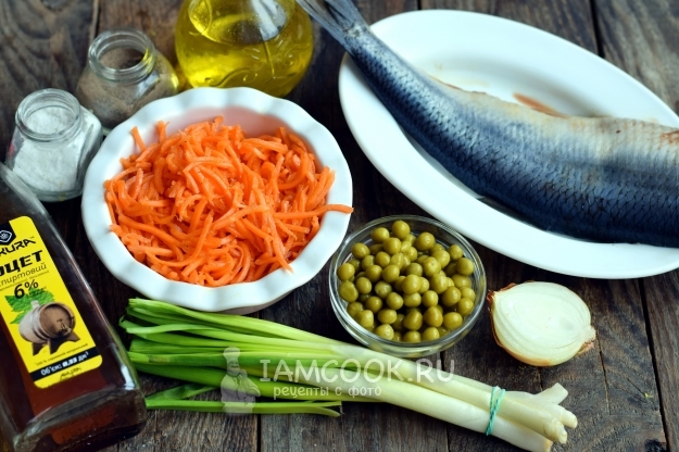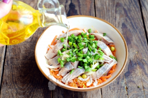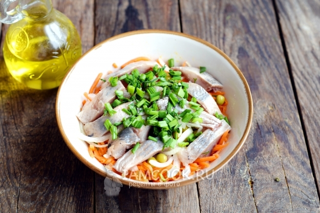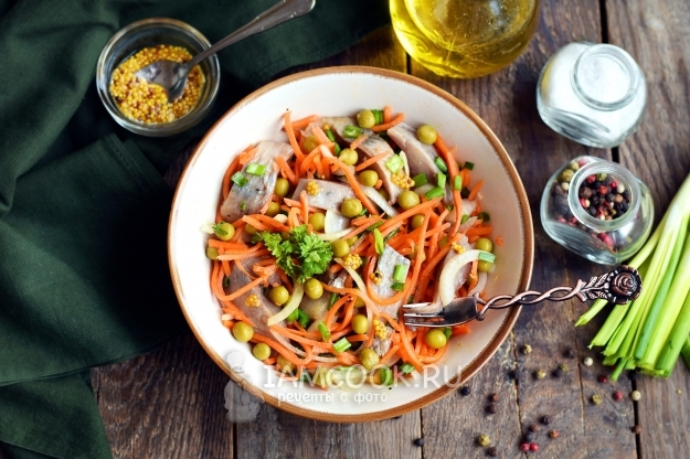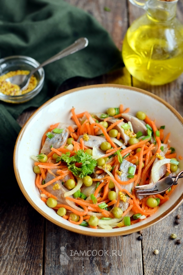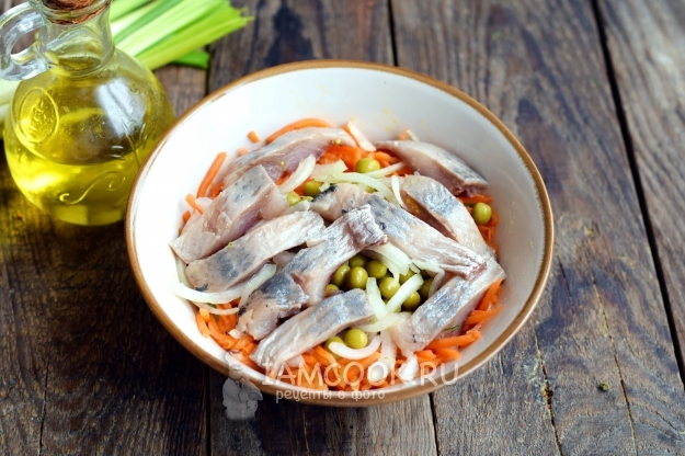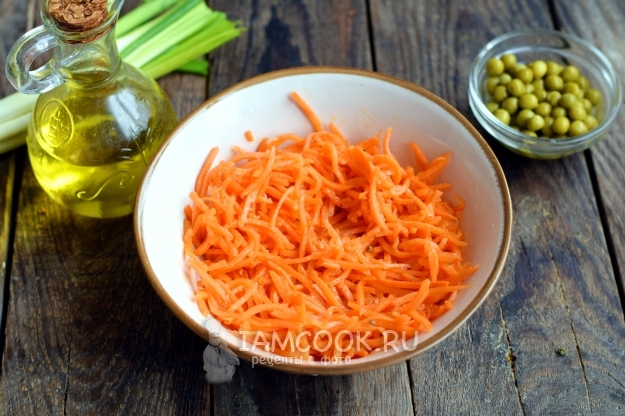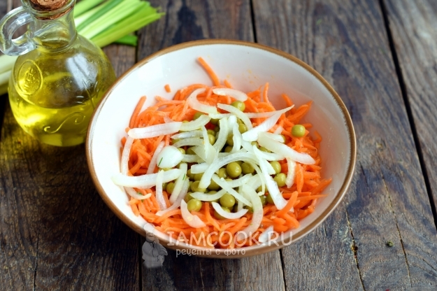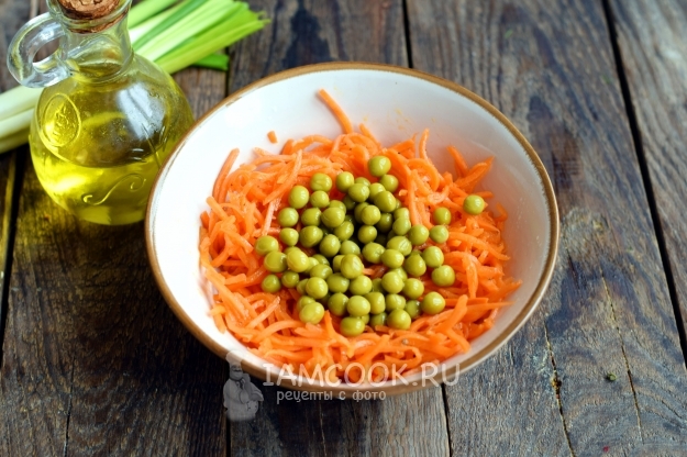 Зеленый горошек также освободите от маринада, добавьте к моркови.