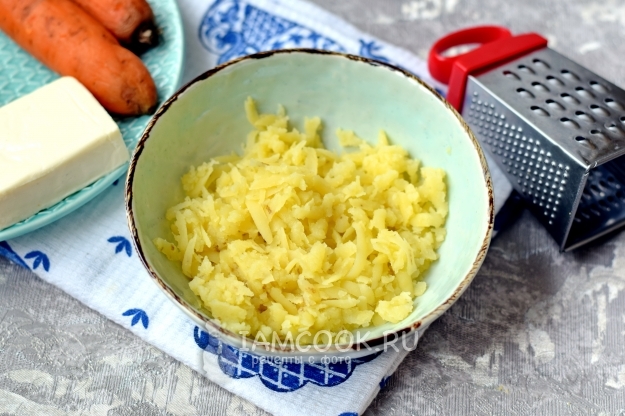 Картофель отварите заранее, чтобы клубни успели остыть. Варите плод в кожуре до готовности - примерно 15 минут после начала бурления воды. После остывания очистите его от кожицы, натрите на терке с крупными или средними отверстиями. Морковь также отварите до мягкого состояния, остудите.