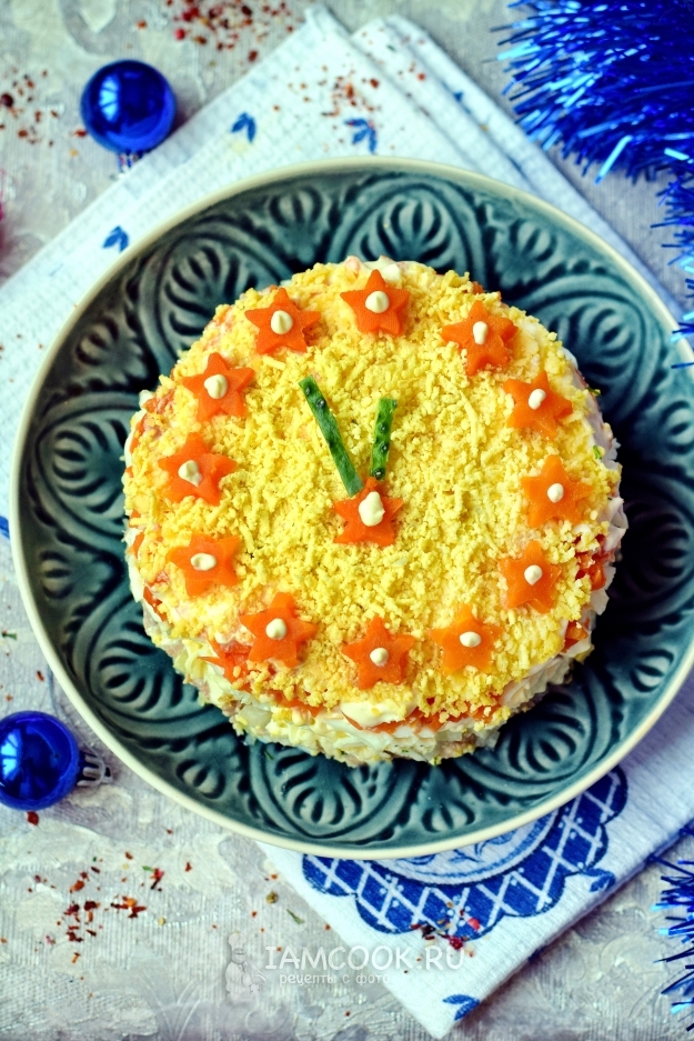 Салат украшается перед самой подачей. Верхний слой присыпьте измельченными желтками. Из моркови сделайте 13 кружков для имитации «Новогодних часов». Кружки при желании можно заменить звездочками или другими фигурками по желанию. 12 звездочек уложите по кругу, 1 - в центр. Из майонеза сделайте на моркови цифры, можно просто точки. Стрелки часов вырежьте из кожуры огурца.