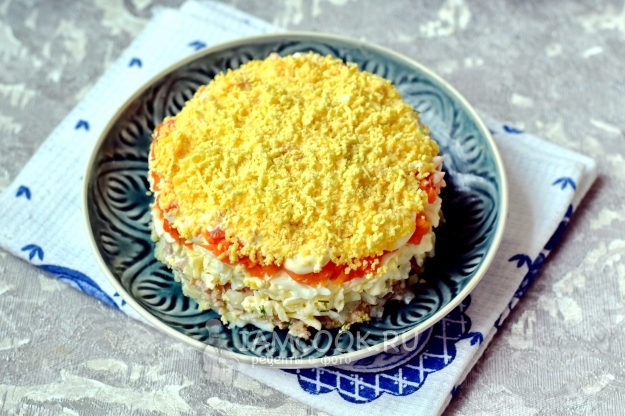 Когда все необходимые компоненты подготовлены, можно начать формировать салат. Выкладывать слои можно с помощью формовочного кольца, или самостоятельно придать салату круглую форму. Укладывайте продукты в определенной последовательности — картофель, печень трески, лук, сыр, яйца и морковь. Каждый слой, кроме печени, смажьте майонезом. Некоторые слои можно слегка присыпать солью. Салат поставьте в холодильник на один час для пропитки. При этом накройте его пищевой пленкой.
