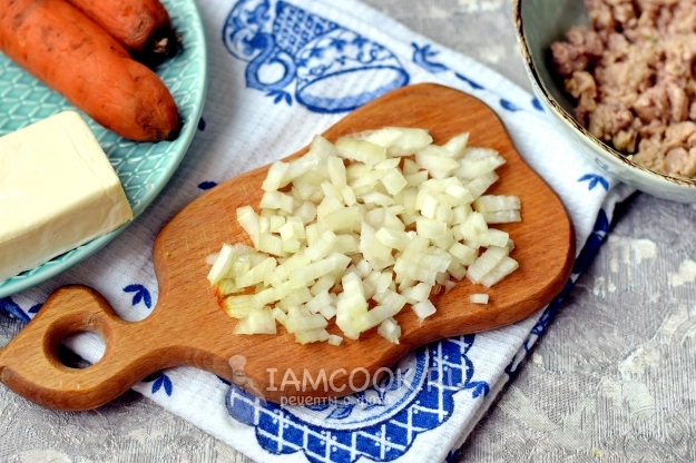 С головки лука снимите шелуху, ополосните, настрогайте небольшими кубиками.