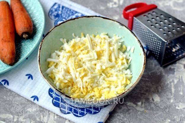 Яйца предварительно отварите до состояния «вкрутую», охладите в прохладной воде, удалите скорлупу, также натрите. 1 или 2 желтка оставьте для украшения верхнего слоя салата.