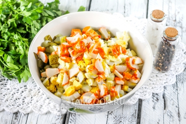 Так же, как и остальные продукты, нарежьте вареные куриные яйца и крабовые клешни, слегка подождав, пока с них сольется масло.