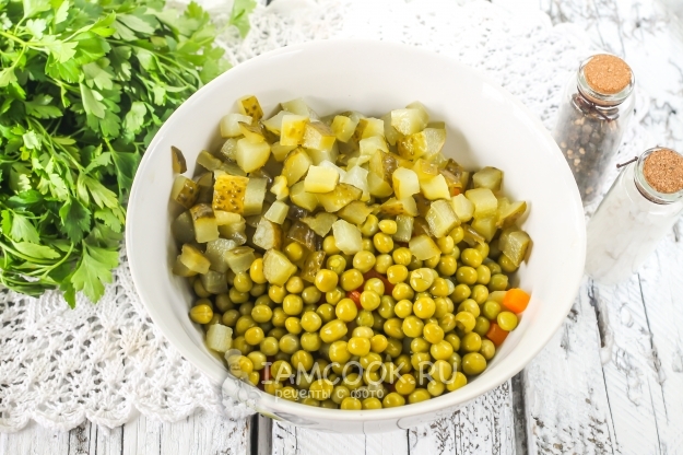 Как я указывала выше, огуречную нарезку отожмите от рассола и добавьте с откинутым на дуршлаг консервированным зеленым горошком.
