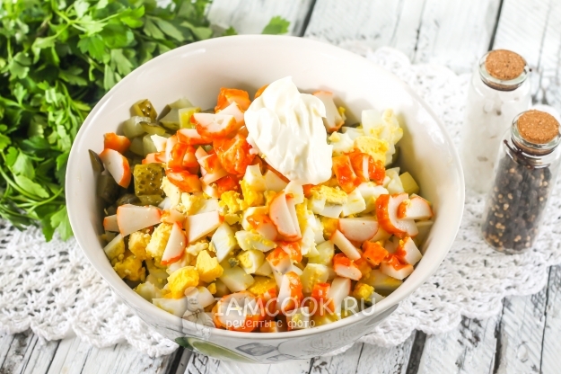 Слегка присолите нарезки, помня о том, что там уже присутствуют квашеные огурцы, выложите майонез и перемешайте.