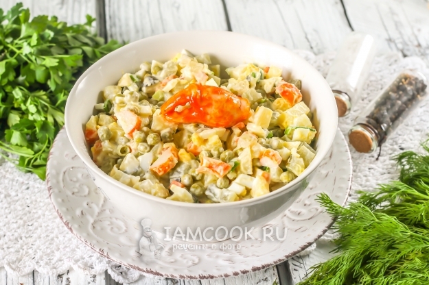 Подайте салат к столу сразу же или охладите в холодильнике, на балконе, украсив по желанию. Теперь вы знаете, как приготовить классический салат «Оливье» с крабом!